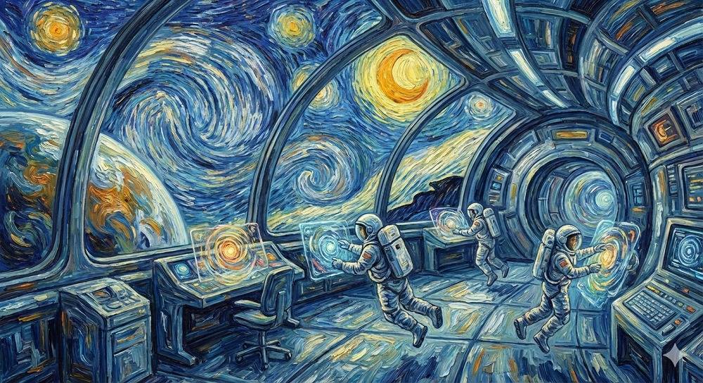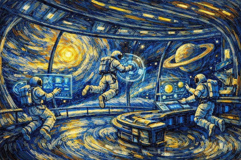 用梵高《星空》的笔触和色彩风格,描绘一座未来主义太空站的内部大厅:巨大的弧形玻璃窗外是旋转的星云和行星,室内有三名宇航员正在低重力环境中漂浮操作全息界面。保持强烈旋涡状笔触,但结构清晰、物体可辨。