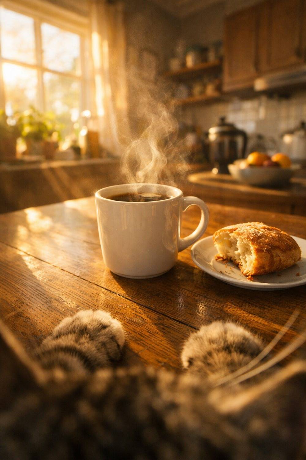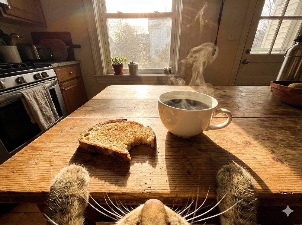 从猫的第一人称视角看到的画面:清晨的厨房,阳光从窗户斜射进来,桌面上有一杯正在冒热气的咖啡和一块咬过的面包。画面下方隐约可见猫的前爪和胡须边缘,广角镜头,温暖色调,生活摄影风格,高细节真实质感。