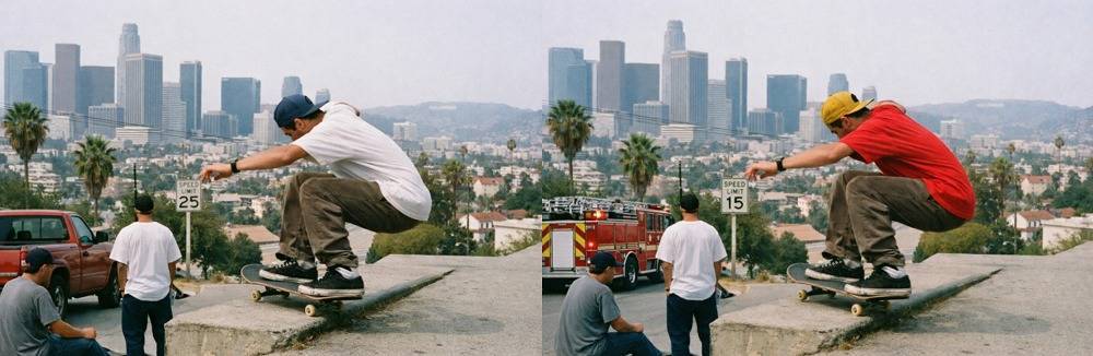 下图则体现了GPT Image 1.5在元素替换方面的表现,提示词要求把左图人物的上衣变成红色,帽子变成黄色,限速改为15,卡车变成消防车,这些都得到了不错的还原。