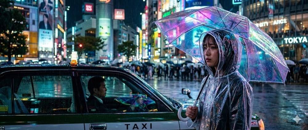 一幅超写实风格的画面:雨夜的东京街头,霓虹灯映照在湿漉漉的路面上。前景是一位穿着透明雨衣的年轻女性,手持发光的全息伞;中景有一辆正在缓慢行驶的出租车,车窗内可见司机的侧脸;背景是高楼林立的城市天际线与模糊的人群。电影感构图,浅景深,4K细节。